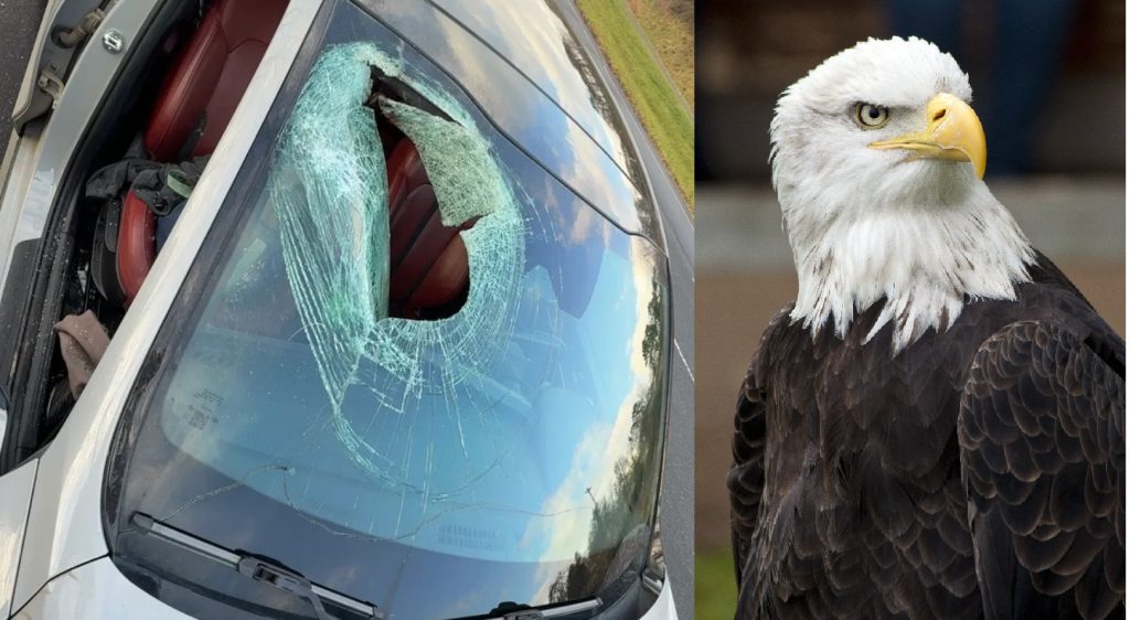 Melissa Schlarb conducía tranquilamente por la US-74 el 19 de noviembre cuando vio pasar una sombra enorme sobre el parabrisas. Miró arriba y descubrió a una imponente águila calva volando con total elegancia… hasta que dejó caer lo que llevaba en las garras: un gato muerto que aterrizó directo contra el cristal del auto.