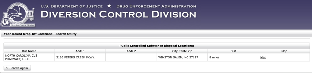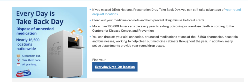 La DEA ofrece una herramienta en línea para localizar fácilmente un punto de entrega permanente (“Everyday Drop-Off”) cerca de tu hogar.