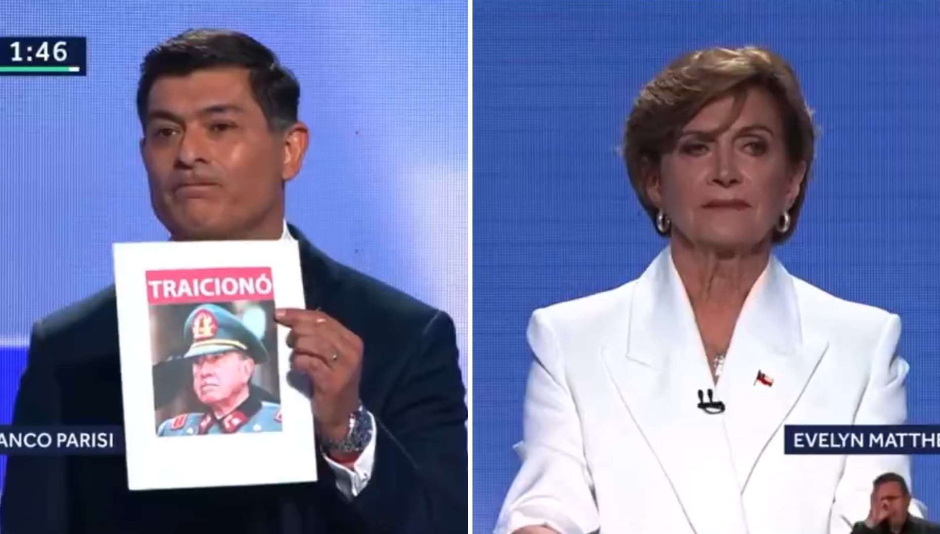 Y es que cuando al fundador del PDG le tocó hacerle una pregunta a Evelyn Matthei, la acusó de traicionar al expresidente Piñera y a Pinochet.