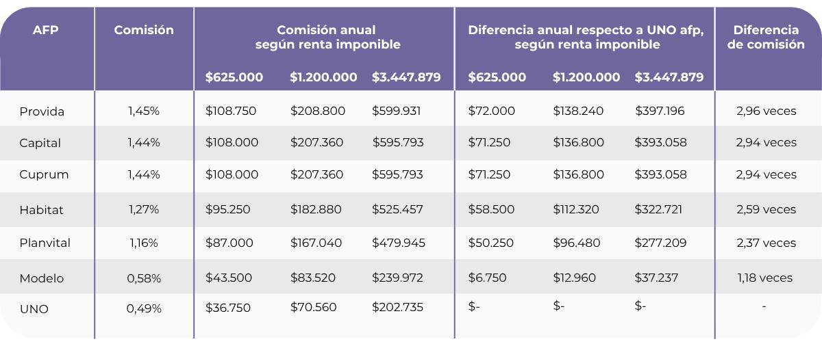 UNO afp cobra solo un 0,49%, la comisión más baja entre todas las AFP de Chile. Por ejemplo, si ganas $1.000.000 al mes, pagarías solo $4.900.