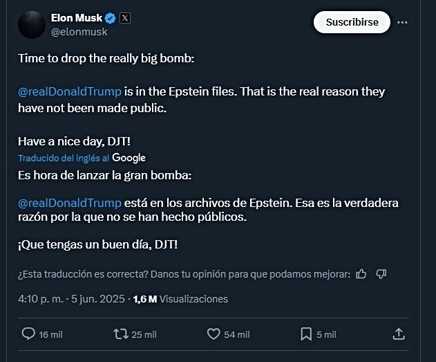 En X (antes Twitter), Musk escribió: “Es hora de lanzar la gran bomba: Donald Trump está en los archivos de Epstein. Esa es la verdadera razón por la que no se han hecho públicos.¡Que tengas un buen día, DJT!“. Solo unos minutos después, completó: “Guarda esta publicación para el futuro. La verdad saldrá a la luz”.